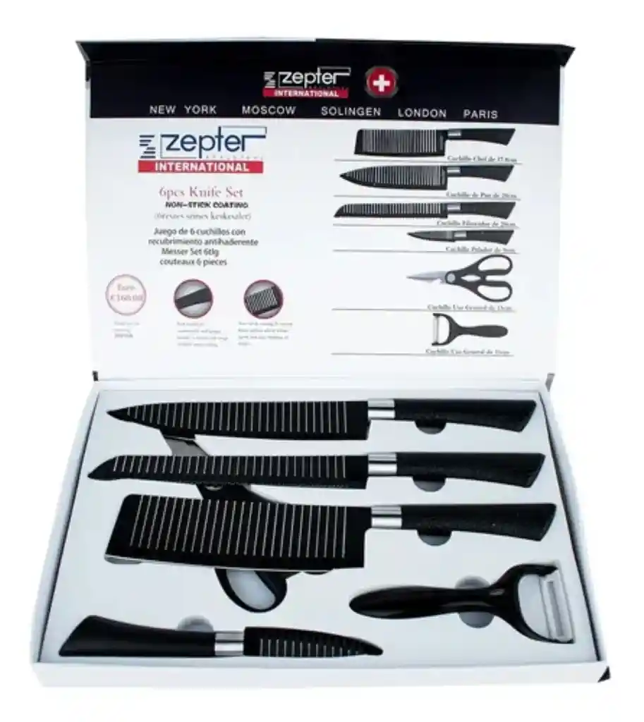 La marca ZEPTER INTERNATIONAL tiene como objetivo ofrecer a sus usuarios los más confortables, duraderos e innovadores productos. Calidad y precisión son el foco primordial en sus productos, los cuchillos chef zepter son el kit perfecto para que cocines más fácilmente, contiene 6 diferentes piezas diseñadas para usos en específico. La base del cuchillo de recubrimiento antihaderente es muy afilada con una apariencia elegante color Negro y mango ergonómico, por lo que hace que este conjunto de cuchillos chef zepter sea adecuado para usar en todas las preparaciones de su cocina. Incluye: Cuchillo de cocina 7' (17,8 cm) Cuchillo de carne 8' (20 cm) Cuchillo de pan 8' (20 cm) Cuchillo para legumbres 3' (9 cm) Tijera de cocina Pelador