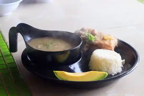 Cuchuco de trigo con espinazo de cerdo (Sopa de cuchuco con espinazo de cerdo) Acompañamiento Espinazo ,Arroz, plátano, papa, Guacamole, arepa, Jugo natural.