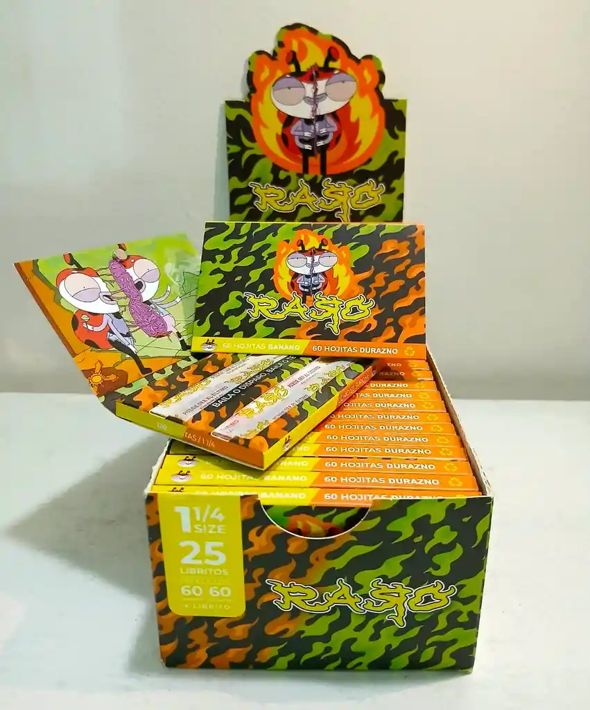Papel Marca Raro Doble Sabor Intenso Goma natural Contiene dos tipos de sabor Cereza y Mango Cada Sabor viene de 60 unidades En total llevas 120 papeles Papel de combustión Lenta Ultra delgado Tapa Imantada Tamaño #9