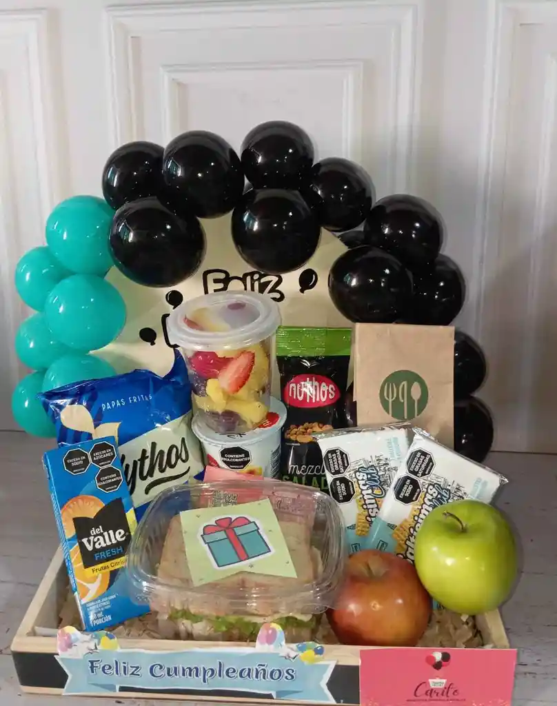 Contenido: 1 Jugo Natural 1 Yogurt de Fresa 2 Manzanas 1 Sándwich de Jamón, Queso y vegetales. 2 Galletas Fitness 1 Maní o Frutos Secos 1 Porción de Fruta picada : Piña, Uvas, Fresas, Ciruelas. 1 Bandeja de Madera Mdf 1 tarjeta Personalizada 1 Decoración Personalizada
