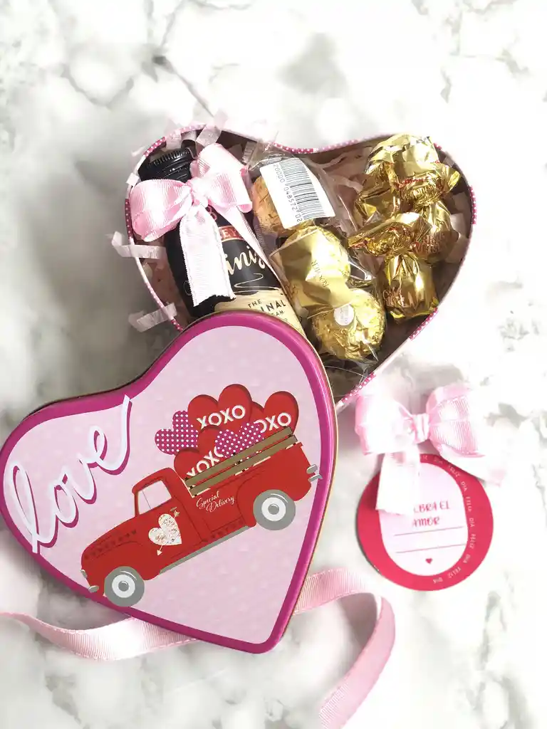 lata en forma de corazón que incluye: Mini Bayleis, 3 chocolates y paquete de Ferreros x3.