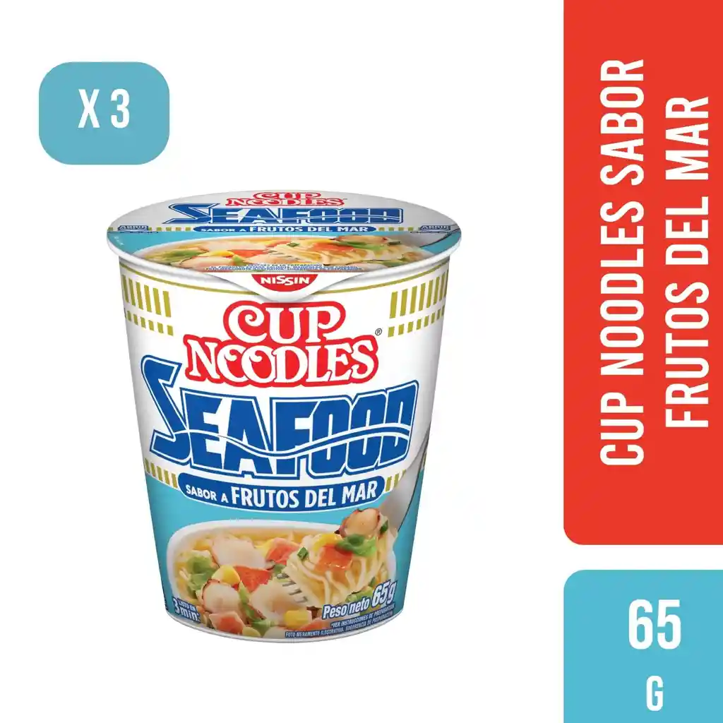 Sopa de fideos instantáneos lista en 3 minutos sabor Frutos del mar, Contiene Cebollin, repollo, calamares, palmitos de cancrejo y maíz. CREADOR DE ALIMENTOS DE LA TIERRA: Un alimento revolucionario, que sólo necesita de agua caliente para cocinarse y en dos minutos está listo para comerse. En el Grupo NISSIN FOODS, exploramos varias posibilidades para la comida y creamos deliciosos sabores que inspiran sueños. Nuestra forma de contribuir a la sociedad y a la Tierra es deleitando a las personas del mundo con el placer que sólo la comida puede darnos. La frase "CREADOR DE ALIMENTOS DE LA TIERRA" expresa abiertamente nuestro deseo de ayudar al mundo y a sus habitantes por medio de la creación de alimentos, la base de toda la vida. Los granos que crecen en el suelo son el punto de partida de todos los alimentos, y nuestra misión como Grupo NISSIN FOODS es la de crear y seguir produciendo alimentos, gracias a la abundancia de la Tierra y su precioso suelo.