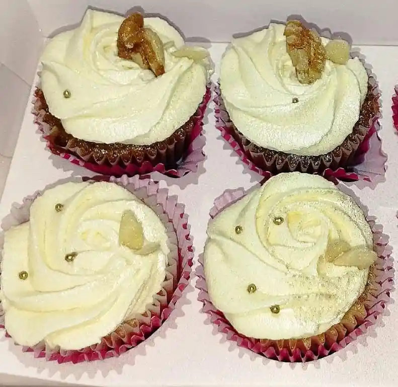 Delicioso cupcakes de zanahoria con banano ciruela pasas y nueces. Decorado con crema de queso. caja x 4
