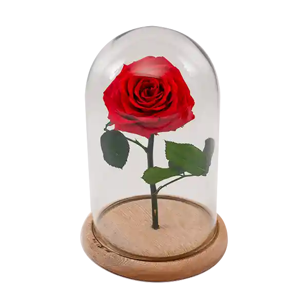 Cúpula de Vidrio Con Base de Madera Con Rosa Premium Tallo Rojo Natural Preservada en su Interior. Tamaño 25 x 15 cm