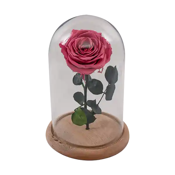 Cúpula de Vidrio Con Base de Madera Con Rosa Premium Tallo Palorosa Natural Preservada en su Interior. Tamaño 25 x 15 cm