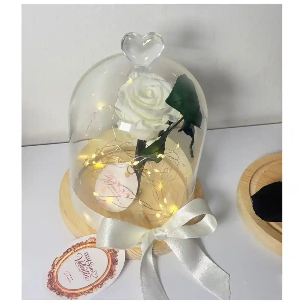 Cúpula mediana de cristal con detalle de corazón en la punta, rosa blanca estándar, base de madera color beige, luces LED de ambientación, lazo decorativo y tarjeta personalizada . Un regalo elegante y delicado para sorprender hoy mismo.