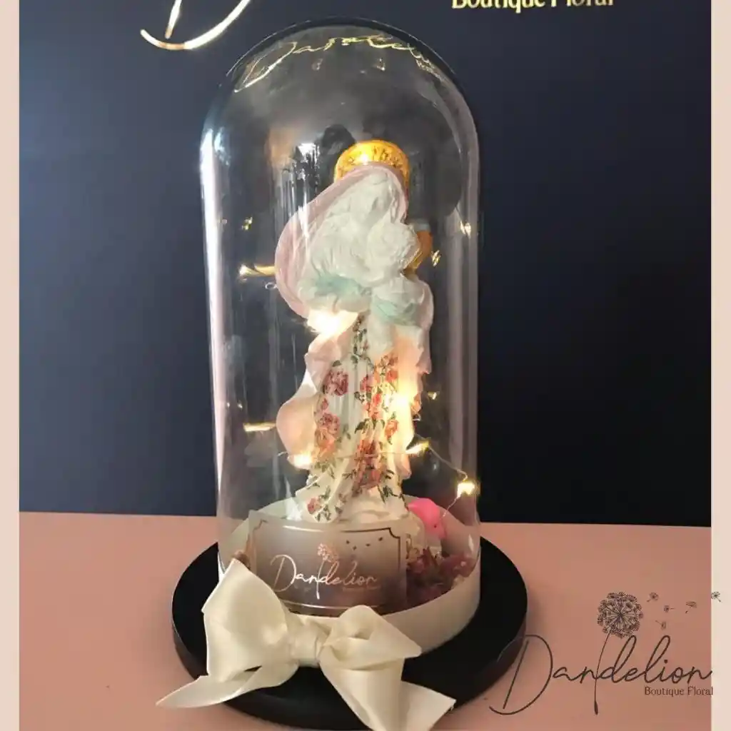 Hermoso Cúpula de la virgen de la salud, con flores inmortalizadas y luz, viene empacada en tull, con tarjeta. La virgen es en marmolina, la cúpula tiene una altura de 26 cms