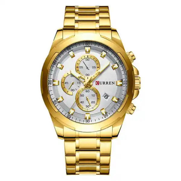 Reloj Curren 8354Ggd Hombre Color: Dorado Material Acero Inoxidable Color Tablero: Plata Material Cristal: Mineral Tipo: Análogo Forma: Circular Tipo de Movimiento: Cuarzo Tipo de Cierre: Desplegable Calendario: Cronógrafo Resistencia al Agua: 30 Ancho de Banda: Largo de Banda: Tono de Caja Dorado Material de Caja Aleación