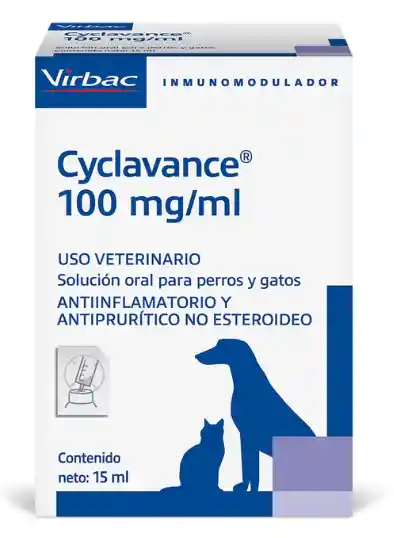 Cyclavance® es una solución oral de uso veterinario indicada para el tratamiento de enfermedades dermatológicas en perros y gatos, como dermatitis atópica y afecciones inflamatorias de la piel. Su principio activo es ciclosporina A, un inmunomodulador que actúa controlando la respuesta inmune sin los efectos secundarios típicos de los corticoides. Beneficios: Potente antiinflamatorio y antiprurítico no esteroideo Alivia el rasquiña persistente y reduce la inflamación cutánea Apto para uso prolongado sin los efectos colaterales de los esteroides Fácil administración oral con jeringa dosificadora