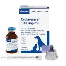 NOMBRE DEL PRODUCTO: CYCLAVANCE X 15 ML – VIRBAC DESCRIPCIÓN: Inmunosupresor oral indicado para el tratamiento de la dermatitis atópica en perros. Su principio activo, ciclosporina A, actúa modulando la respuesta inmunitaria del organismo, ayudando a reducir la inflamación y el prurito asociados a enfermedades alérgicas crónicas de la piel. Fácil de administrar gracias a su formato líquido y dosificador preciso. CONTENIDO: Cada mL contiene: Ciclosporina A: 100 mg Excipientes c.s.p.: 1 mL PRESENTACIÓN: Frasco gotero x 15 mL VÍA DE ADMINISTRACIÓN: Oral USO: Veterinario CONDICIONES DE USO: Administrar directamente en la boca del animal o mezclado con una pequeña cantidad de alimento. No administrar junto con alimentos completos. Usar bajo prescripción del médico veterinario. Conservar en un lugar fresco, seco y protegido de la luz. Mantener fuera del alcance de los niños.