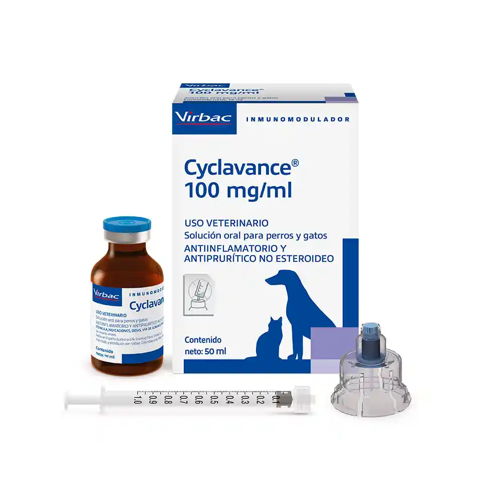 Cyclavance® es una ciclosporina para el tratamiento de procesos de dermatitis alérgica en perros y gatos. Inmunomodulador, Antiinflamatorio y Antiprurítico no esteroideo. Indicaciones y Usos: Tratamiento de manifestaciones crónicas de la dermatitis atópica en perros. Reduce la inflamación y prurito asociado con la dermatitis atópica. Tratamiento sintomático de dermatitis alérgica crónica en gatos. Intervalo entre dosis: Diariamente hasta mejoría de los signos. Duración del tratamiento: A criterio médico veterinario. Debe ajustarse a la respuesta del paciente. Vía de administración: Oral