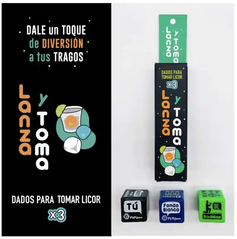Dados para tomar licor con amigos. ¡Haz que la noche se haga más divertida! Dale un toque de diversión a tus tragos. Lanza, toma, haz la prueba que toca y diviértete. Dados para tomar licor. Contiene 3 dados.