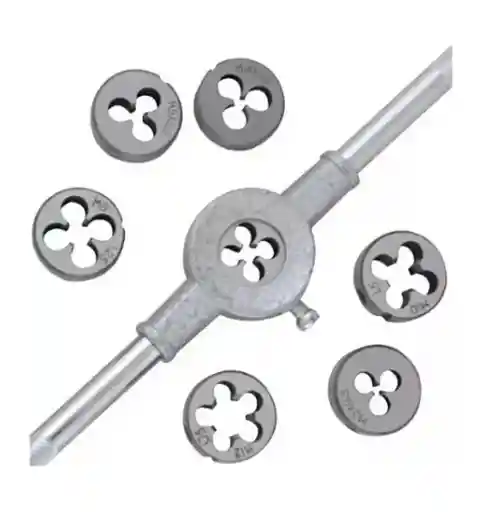 CARACTERISTICAS • Fabricado en acero rápido; • Incluye 8 partes de la siguiente manera: - 1 de 1 Guía de Apoyo "; - 7 Tarrajas: M3x0.5, M4x0.7, M5x0.8, M6x1.0, M8x1.25, M10x1.5 y M12.1,75; • Permite abrir roscas en una amplia gama de diámetros de tubos y electroductos con sólo un juego de costillas. • Marca: UYUSTOOLS