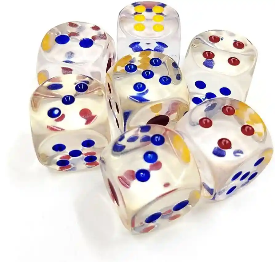 Par de dados transparentes colores vivos mide 3 cm aprox