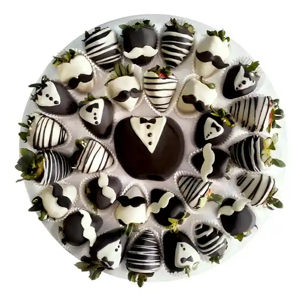 ¡El regalo ideal para él! Bandeja de 30 fresas con chocolate y centro de manzana con chocolate decorada con motivos masculinos.