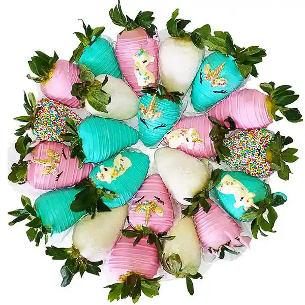 Deliciosa bandeja de fresas con chocolate, tonos: rosado, turquesa y blanco con lindas decoración de unicornios de chocolate. X25 fresas de primera calidad. Agrega el mensaje para la tarjeta dedicatoria en el chat del pedido.