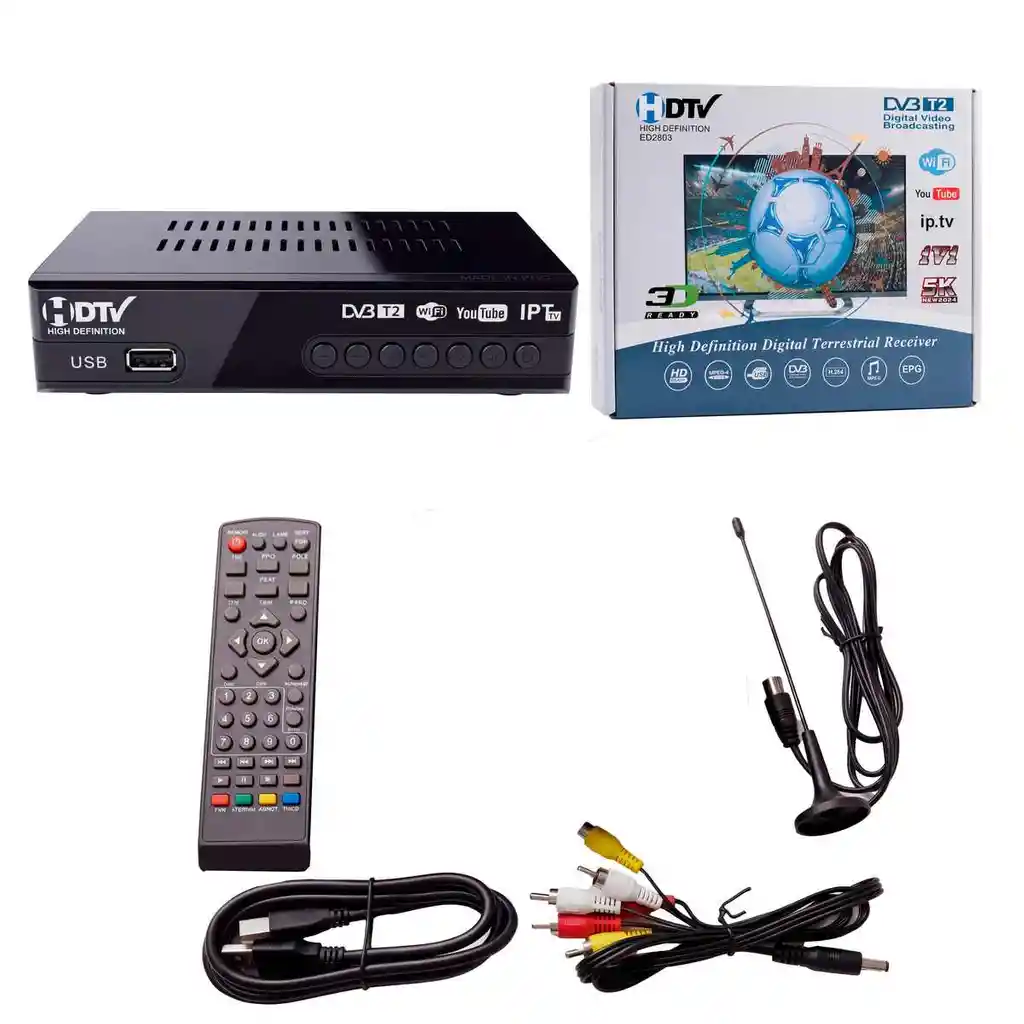 Actualiza tu entretenimiento con este potente decodificador digital terrestre DVB-T2 de última generación, diseñado para sintonizar todos los canales nacionales en alta definición (HD) sin pagar facturas mensuales. Este receptor no solo te brinda una señal de TV nítida y estable, sino que transforma tu televisor en un centro multimedia gracias a su antena Wi-Fi incluida, permitiéndote disfrutar de YouTube y servicios de IPTV directamente en pantalla. Cuenta con funciones avanzadas como grabación programada mediante USB, reproducción de archivos multimedia (fotos, música y videos) y una interfaz amigable compatible con televisores antiguos (vía RCA) y modernos (vía HDMI). Es la solución más completa, económica y fácil de instalar para disfrutar de la mejor programación con calidad digital superior. Ficha Técnica Producto: Decodificador Digital Terrestre DVB-T2 Estándar de recepción: DVB-T2 / DVB-T (H.264 / H.265 compatible) Resolución de video: Full HD 1080p, 1080i, 720p y 576p Conectividad: HDMI, RCA (Audio y Video), USB 2.0 Funciones de red: YouTube, IPTV y actualización vía Wi-Fi (Antena incluida) Puerto USB: Soporta grabación PVR y reproducción multimedia Guía de programación: EPG (Electronic Program Guide) de hasta 7 días Memoria: Almacenamiento de hasta 1000 canales de TV y radio Pantalla: Display LED frontal para visualización de canales Alimentación: 100V - 240V AC (Multivoltaje) Certificación: Cumple con el estándar de televisión digital terrestre para Colombia Políticas de Garantía Este producto cuenta con una garantía de 30 días calendario que cubre únicamente defectos técnicos de fabricación o fallos en el software del sistema. No se aceptarán garantías si el equipo presenta daños físicos causados por variaciones de voltaje, golpes, humedad, o si el puerto de antena (RF) se encuentra desprendido por mala manipulación. Los cables y el control remoto son accesorios de cortesía y no tienen garantía una vez se verifique su funcionamiento inicial. Para cambios, el producto debe devolverse en su caja original con todos sus protectores y empaques en perfecto estado.