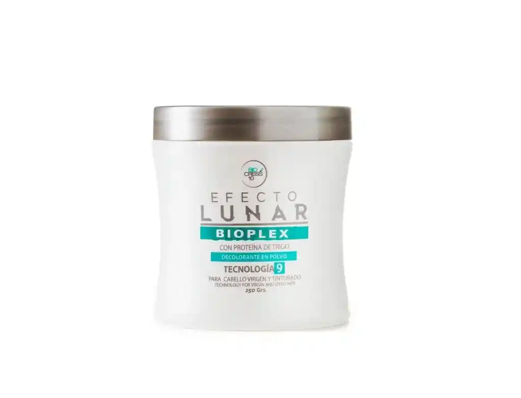 Polvo decolorante Biocress 10 efecto lunar Olaplex, con alta capacidad aclarante y acción protectora, proporciona las bondades de la proteína de trigo y arroz, y actuando de forma intensa y rápida, sin dañar o agredir la estructura del cabello. Indicado para realizar aclaraciones del cabello natural y con coloraciones a oxidación (decapage). Modo de uso: Mezclar una parte del polvo decolorante BIOCRESS 10 con tres partes del Oxidante Capilar Cremoso (10, 20, 30, o 40 volúmenes de acuerdo al grado de decoloración que desee) en un recipiente No metálico. Incorporar hasta lograr una pasta homogénea. Aplique sobre cabellos secos, sin lavado previo. CABELLOS PROCESADOS: Comenzar la decoloración en largos y puntas sin llegar a raíces. Dejar actuar hasta obtener la decoloración deseada y luego aplicar hasta las raíces en un tono uniforme. El tiempo de exposición puede llegar hasta los 60 minutos, dependiendo de la base en la cual se aplique. RETOQUE DE RAÍCES: Aplicar la mezcla solamente en raíces sin tocar las zonas decoloradas anteriormente. Dejar actuar hasta obtener la decoloración deseada. Una vez obtenida la base de su preferencia, enjuague con abundante agua tibia, lave con Shampoo y Tratamiento.