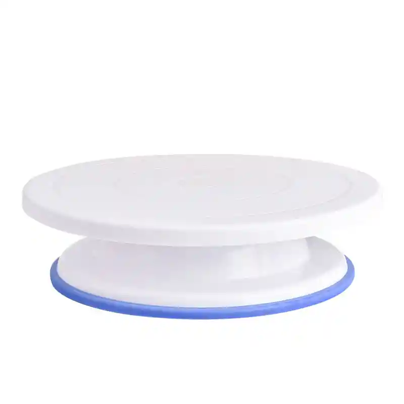 "Base giratoria para decoración de tortas y pasteles. Rotación de 360 grados Material: Plástico Color: Blanco Medidas: 27.5 cm x 7.5 cm"