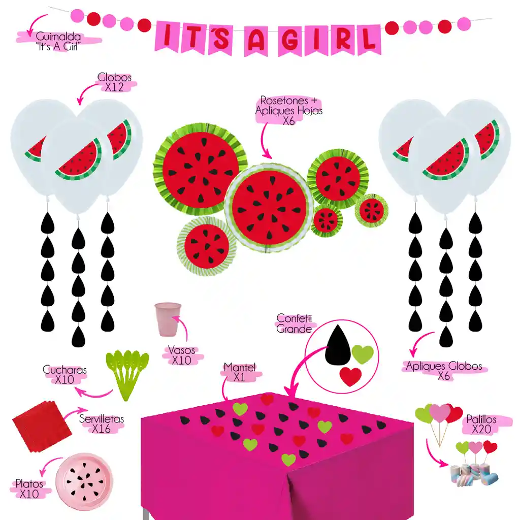 "KIT de decoración (Tamaño ""XL"" Grande) para celebrar la llegada de una niña. El KIT incluye: 1 guirnalda ""It´s a Girl"" (230 cm ancho) + 12 bombas blancas estampadas con patillas + 1 paquete x6 un apliques para globos (semillas de patilla) + 1 paquete X6 Un.de Rosetones con decoración de patilla + 1 paquete X20 uni. de palillos (para pasabocas) + 1 mantel rectangular Fucsia + 1 paquete de confetii grande (corazones + semillas de patilla) + 1 paquete de platos rosa X10 Un (21 cm de diámetro) + 1 paquete de servilletas rojas X16 Un. + 1 paquete de vasos rosa claro X10 Un. + 1 paquete de cucharas verdes X12 Un."