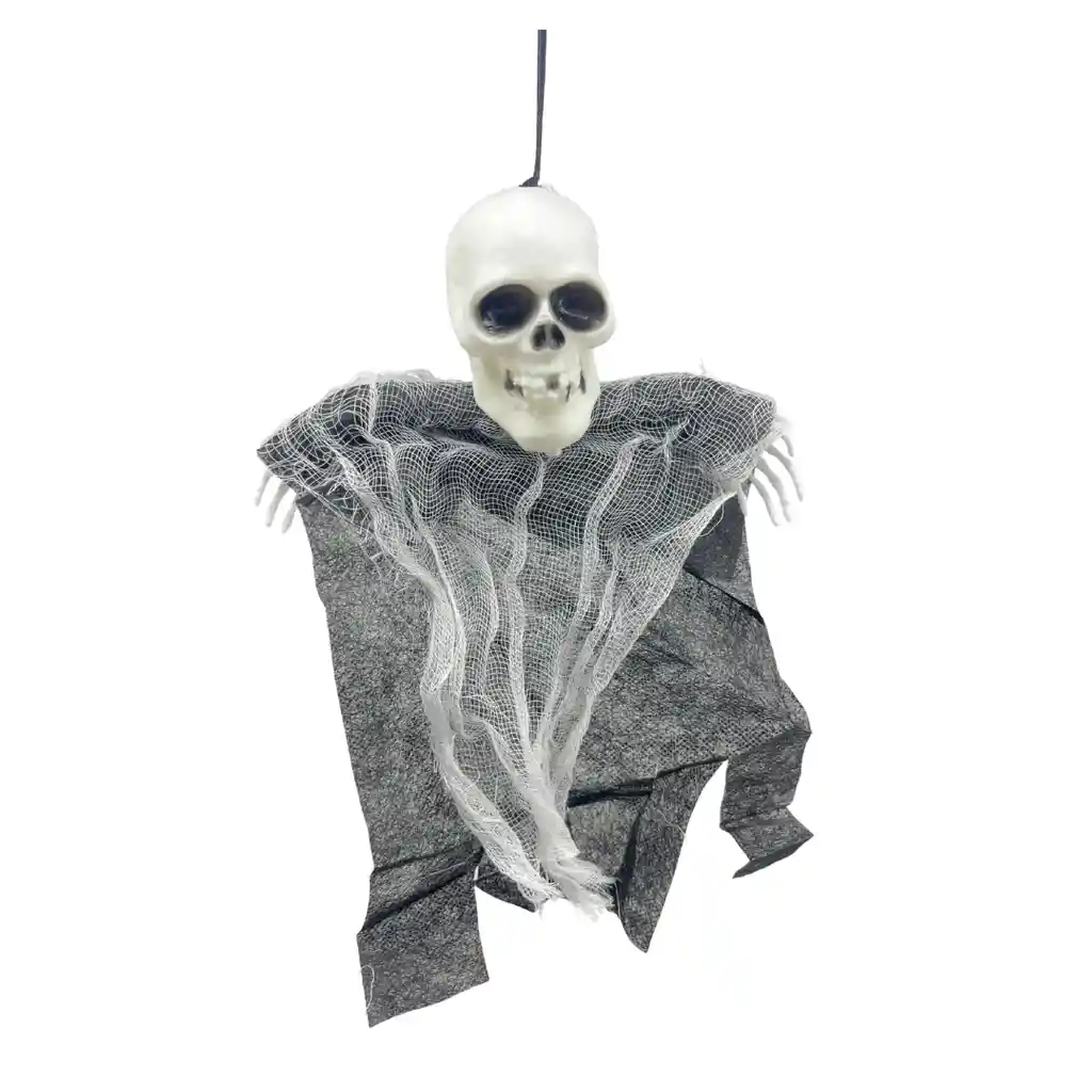 Decoración colgante móvil disponible en dos estilos espeluznantes: uno con figura de La Muerte encapuchada y otro con calavera fantasmal. Ideales para colgar en puertas, techos o ventanas y dar un toque tétrico y flotante a tus espacios en Halloween.