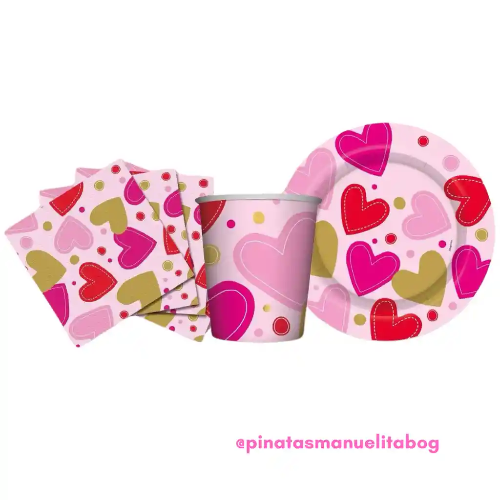 Kit decoración en cartón estampado con corazones rosado ideal para decorar la mesa, incluye: ·1 Paquete de platos para postre o torta en cartón x 8 und ·1 Paquete de vasos 7 onz en cartón x 8 und ·1 Paquete de servilletas x 16 und Estampadas 1 Paquete de tenedores x 12 und Color: Rosado, rojo o dorado según disponibilidad.