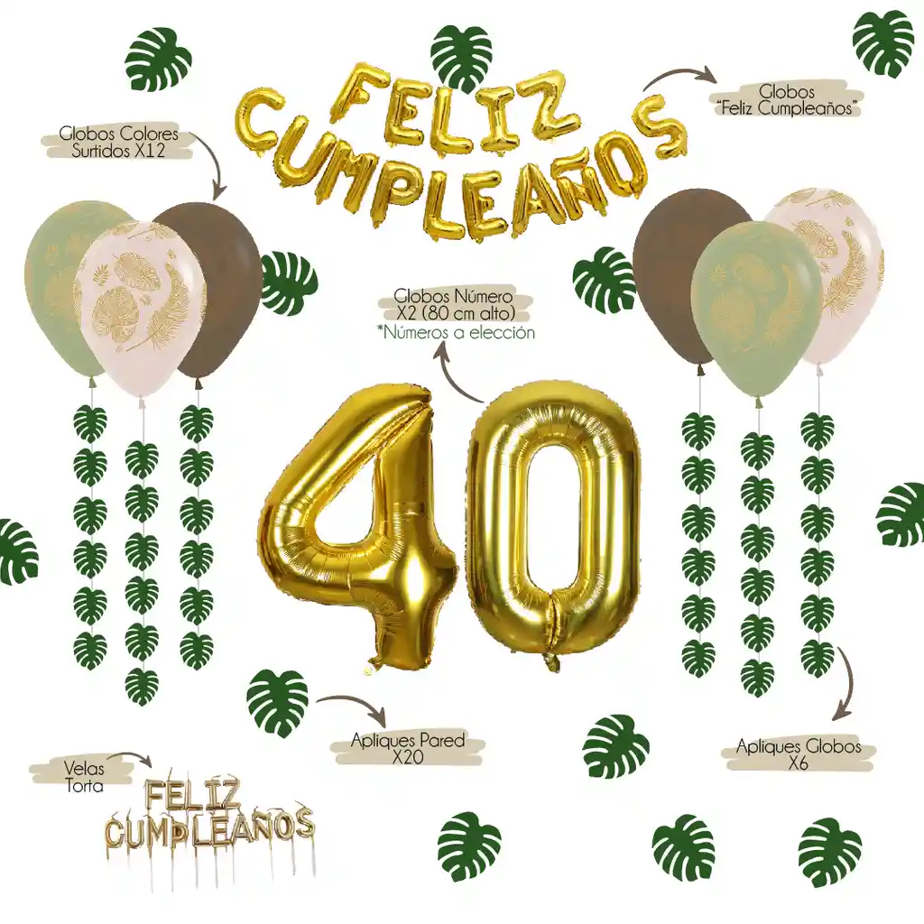 "***Escríbenos un mensaje con los números de globo que necesitas (X2) KIT de decoración (Tamaño ""S"" pequeño) para celebrar una fiesta de cumpleaños tropical pero sobria. El KIT incluye: 1 letrero para inflar de globos metalizados dorados ""Feliz Cumpleaños"" + 12 bombas con colores surtidos estampados con hojas + 1 paquete X6 Un. de apliques de Hojas para colgar sobre las bombas + 2 Globos de número, 80 cm de alto (metalizados dorados) ***Escríbenos un mensaje con los (2) números que necesitas + 1 paquete X20 Un.de Apliques de Pared + 1 paquete de velas para la torta doradas ""Feliz Cumpleaños"""
