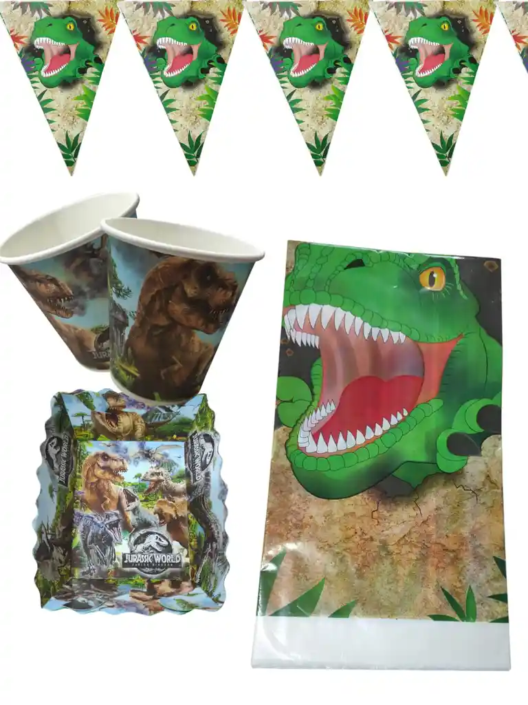 Decoracion fiestas infantiles de dinosaurio 1 banderin largo aproximado de 2 metros 10 vasos 10 platos 1 mantel plastico los globos se envian sin inflar si deseas algo adicional indicanos y con gusto te colaboramos
