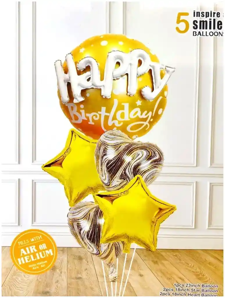 *********************GLOBOS Y PELUCHES MASMELO********************* Por tu compra te llevas: 1 Globo Happy birthday 58x58 cm + letras inflables Happy Birthday + pegatina para pegar letras 2 GLobo corazón negro agata 45x45 cm 2 Globo estrella metalizada amarilla 45x45cm 1 Pitillo para inflar globos *Los globos se entregan desinflados, tu compra no incluye el montaje ni la decoración, el servicio de armado no lo tenemos disponible. sin embargo te damos todas las instrucciones para hacer de modo profesional. Si deseas adicionar otros articulos a tu compra puedes escribirnos, recuerda que Somos Globos y Peluches Masmelo ;) - En ciudades fuera de Bogotá despachamos para el mismo día si compras antes de las 11AM (no incluye festivos) - En Bogotá despachamos para el mismo día, si haces el pedido antes de las 4PM (no incluye festivos)