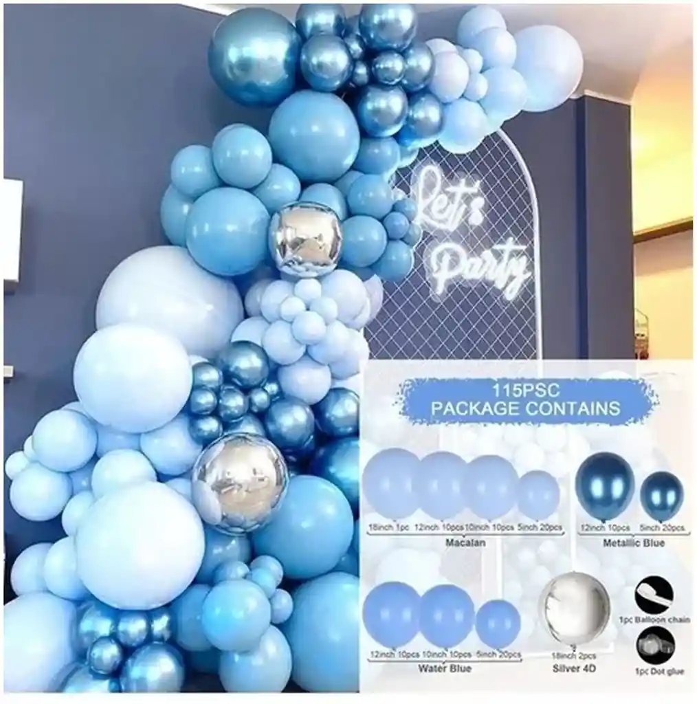 *********************GLOBOS Y PELUCHES MASMELO********************* Te damos toda la asesoria para que tú puedas armar tu propio arco Por tu compra te llevas: 1 Globo azul celeste grande 45 cm 20 Globo azul celeste 30 cm 20 Globo azul celeste 13 cm 20 Globo azul 30 cm 20 Globo azul 13 cm 2 Globo orbit plateado 45 cm 10 Globo azul cromado 30 cm 20 Globo azul cromado 13 cm -Punto de pegamento: 1 rollo -Cinta de cadena: 1 rollo *Los globos se entregan desinflados, tu compra no incluye el montaje ni la decoración, el servicio de armado no lo tenemos disponible. sin embargo te damos todas las instrucciones para hacer de modo profesional. Si deseas adicionar otros articulos a tu compra puedes escribirnos, recuerda que Somos Globos y Peluches Masmelo ;) - En ciudades fuera de Bogotá despachamos para el mismo día si compras antes de las 11AM (no incluye festivos) - En Bogotá despachamos para el mismo día, si haces el pedido antes de las 4PM (no incluye festivos)