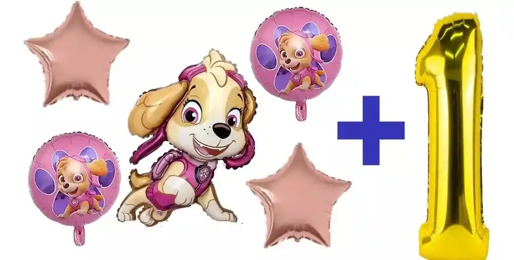 *********************GLOBOS Y PELUCHES MASMELO********************* Somos Mercado Lider Platinum Por tu compra te llevas: 2 Globo estrella rosada 45x45cm 2 Globo temática Paw Patrol 45x45cm 1 Globo Perra Skye 65x45cm 1 Globo número dorado según tu elección 82 cm de altura
