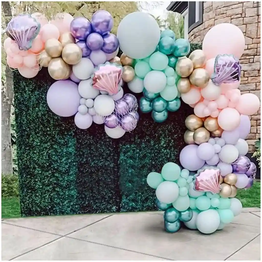 *********************GLOBOS Y PELUCHES MASMELO********************* Por tu compra te llevas: 10 Globo morado pastel 12,5cm 10 Globo morado pastel 30cm 1 Globo morado pastel 45cm 15 Globo rosado pastel 12,5cm 25 Globo rosado pastel 30cm 1 Globo rosado pastel 45cm 15 Globo verde pastel 12,5cm 25 Globo verde pastel 30cm 1 Globo verde pastel 45cm 10 Globo verde cromado 30cm 15 Globo morado cromado 30cm 20 Globo dorado cromado 30cm 2 Globo concha de mar morada 2 Globo concha de mar rosada 1 cinta de arco de 5 metros 1 Cinta de 100 puntos adhesivos para pegar globos *Los globos se entregan desinflados, tu compra no incluye el montaje ni la decoración, el servicio de armado no lo tenemos disponible. sin embargo te damos todas las instrucciones para hacer de modo profesional. Si deseas adicionar otros articulos a tu compra puedes escribirnos, recuerda que Somos Globos y Peluches Masmelo ;) - En ciudades fuera de Bogotá despachamos para el mismo día si compras antes de las 11AM (no incluye festivos) - En Bogotá despachamos para el mismo día, si haces el pedido antes de las 4PM (no incluye festivos)