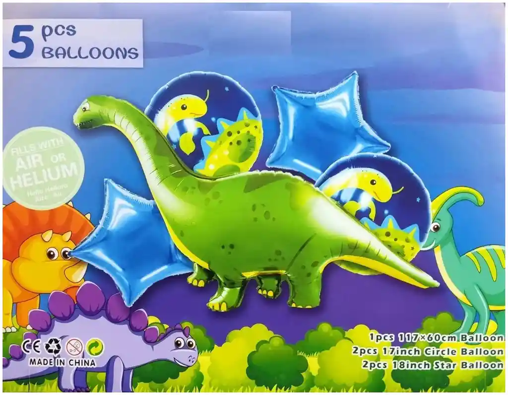 *********************GLOBOS Y PELUCHES MASMELO********************* Por tu compra te llevas: 2 Globo estrella metalizada azul 45x45cm 2 Globo circular temática dinosaurio 45x45cm 1 Globo dinosaurio 110x65cm *Los globos se entregan desinflados, tu compra no incluye el montaje ni la decoración, el servicio de armado no lo tenemos disponible. sin embargo te damos todas las instrucciones para hacer de modo profesional. Si deseas adicionar otros articulos a tu compra puedes escribirnos, recuerda que Somos Globos y Peluches Masmelo ;) - En ciudades fuera de Bogotá despachamos para el mismo día si compras antes de las 11AM (no incluye festivos) - En Bogotá despachamos para el mismo día, si haces el pedido antes de las 4PM (no incluye festivos)