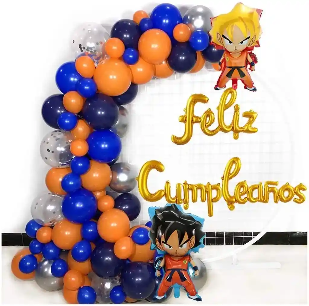 *********************GLOBOS Y PELUCHES MASMELO********************* Te damos toda la asesoria para que tú puedas armar tu propio arco Por tu compra te llevas: 1 Globo letrero de feliz cumpleaños dorado 1 Globo goku cabello negro 60x44cm 1 Globo goku cabello dorado 60x44cm 5 Globo transparente con confetti plateado 25 Globo naranja 30 cm 15 Globo Naranja 13 cm 15 Globo azul rey liso 30cm 20 Globo azul rey 13 cm 8 Globo plateado cromado 30cm 15 Globo azul naval 30 cm Accesorios: -Punto de pegamento: 1 rollo -Cinta de cadena: 1 rollo *Los globos se entregan desinflados, tu compra no incluye el montaje ni la decoración, el servicio de armado no lo tenemos disponible. sin embargo te damos todas las instrucciones para hacer de modo profesional. Si deseas adicionar otros articulos a tu compra puedes escribirnos, recuerda que Somos Globos y Peluches Masmelo ;) - En ciudades fuera de Bogotá despachamos para el mismo día si compras antes de las 11AM (no incluye festivos) - En Bogotá despachamos para el mismo día, si haces el pedido antes de las 4PM (no incluye festivos)