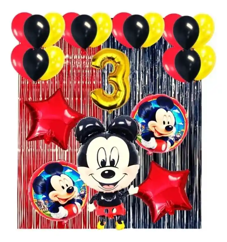 *********************GLOBOS Y PELUCHES MASMELO********************* Por tu compra te llevas. 2 Cortina metalizada flecos rojo negro 1x2m 6 Globo rojo 30 cm 6 Globo negro 30cm 6 Globo amarillo 30cm 1 Globo número 82cm dorado segun tu elección ( luego de realizada tu compra, envias un mensaje indicando el número que necesitas) 2 Globo estrella rojo 45x45cm 2 Globo circular temática Mickey Mouse 1 Globo Mickey Mouse 65x45cm *Los globos se entregan desinflados, tu compra no incluye el montaje ni la decoración, el servicio de armado no lo tenemos disponible. sin embargo te damos todas las instrucciones para hacer de modo profesional. Si deseas adicionar otros articulos a tu compra puedes escribirnos, recuerda que Somos Globos y Peluches Masmelo Si necesitas variación en los colores, colocar un número, más globos o realizar otros cambios en el diseño original escribenos para ver si podemos hacerlo. Tenemos todo lo necesario para tus decoraciones, somos lo último en tendencias mundiales decorativas. Tenemos disponible: Vasos, platos, manteles, guirnaldas, cubiertos, globos de todo tipo, números, letreros, vela, Etc. Puedes encontrar los articulos de nuestra tienda en el siguiente link, copia y pega, si no encuentas lo que necesitas escribenos: https://www.rappi.com.co/tiendas/900280040-globosypeluchesmasmelo-mt-enc/decoracion-para-fiestas/globos-y-bombas