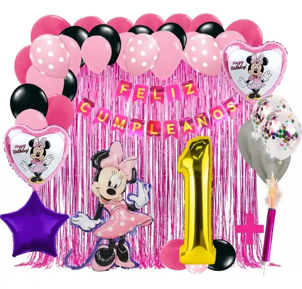*********************GLOBOS Y PELUCHES MASMELO********************* Por tu compra te llevas. 2 Cortina oro rosa 1×2 metros 1 guirnalda feston feliz cumpleaños 2 metros de largo 36 Globo surtido: Negro, fucsia, rosado polka, rosad 30cm 2 Globo circular temática de minnie 2 Globo estrella rosada 45x45cm 1 Globo Minnie 60x50cm 1 Globo número dorado segun tu elección 82 cm de altura 5 metros de nylon para amarrar globos *Los globos se entregan desinflados, tu compra no incluye el montaje ni la decoración, el servicio de armado no lo tenemos disponible. sin embargo te damos todas las instrucciones para hacer de modo profesional. Si deseas adicionar otros articulos a tu compra puedes escribirnos, recuerda que Somos Globos y Peluches Masmelo Si necesitas variación en los colores, colocar un número, más globos o realizar otros cambios en el diseño original escribenos para ver si podemos hacerlo. Tenemos todo lo necesario para tus decoraciones, somos lo último en tendencias mundiales decorativas. Tenemos disponible: Vasos, platos, manteles, guirnaldas, cubiertos, globos de todo tipo, números, letreros, vela, Etc. Puedes encontrar los articulos de nuestra tienda en el siguiente link, copia y pega, si no encuentas lo que necesitas escribenos: https://www.rappi.com.co/tiendas/900280040-globosypeluchesmasmelo-mt-enc/decoracion-para-fiestas/globos-y-bombas