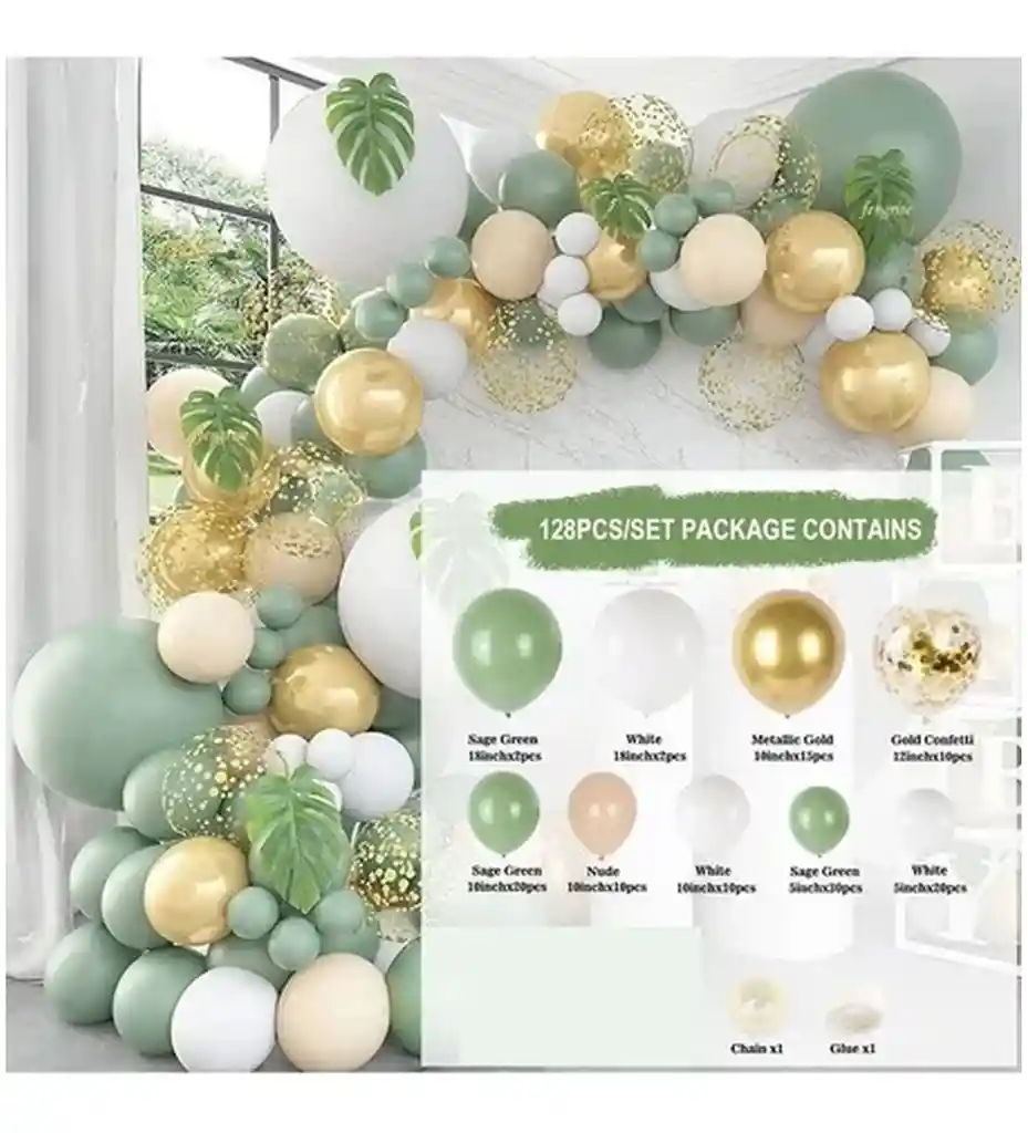 *********************GLOBOS Y PELUCHES MASMELO********************* Te damos toda la asesoria para que tú puedas armar tu propio arco Por tu compra te llevas: 2 Globo verde eucalipto grande 45 cm 2 Globo blanco grande 45 cm 15 Globo cromado dorado 30 cm 10 Globo transparente 30 cm 1 confetti dorado 20 Globo verde eucalipto 30 cm 10 Globo piel 30 cm 10 Globo blanco 30 cm 30 Globo verde eucalipto 13 cm 20 Globo blanco 13 cm -Punto de pegamento: 1 rollo -Cinta de cadena: 1 rollo *Los globos se entregan desinflados, tu compra no incluye el montaje ni la decoración, el servicio de armado no lo tenemos disponible. sin embargo te damos todas las instrucciones para hacer de modo profesional. Si deseas adicionar otros articulos a tu compra puedes escribirnos, recuerda que Somos Globos y Peluches Masmelo ;) - En ciudades fuera de Bogotá despachamos para el mismo día si compras antes de las 11AM (no incluye festivos) - En Bogotá despachamos para el mismo día, si haces el pedido antes de las 4PM (no incluye festivos)