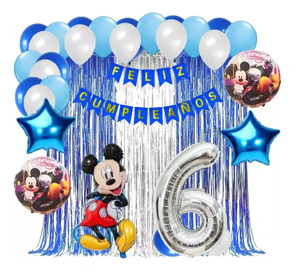 *********************GLOBOS Y PELUCHES MASMELO********************* Somos Mercado Lider Platinum Por tu compra te llevas: 1 Globo Mickey Mouse 65x45cm 2 Globo estrella azul 45x45cm 2 Globo circular temática de Mickey Mouse 45x45cm 1 Globo número plateado segun tu elección 82 cm de altura 1 Feston cumpleaños azul 2 metros de largo 12 Globo azul rey 30cm 12 Globo blanco 30cm 12 Globo azul celeste 30cm 1 Cortina plateado 2x1 metros 1 Cortina azul 2x1 metros 1 Cinta de Arco 5 metros 1 Instructivo de armado de kit
