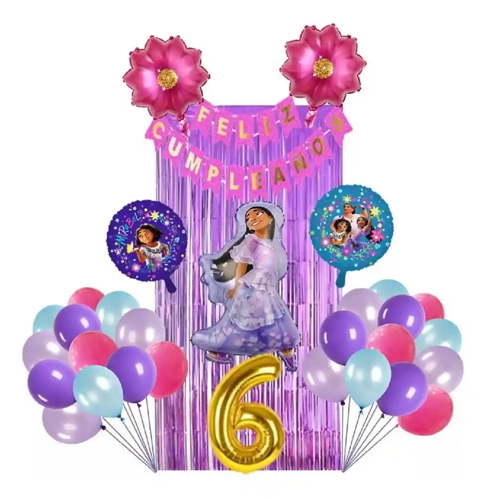 *********************GLOBOS Y PELUCHES MASMELO********************* Por tu compra te llevas. 1 Cortina morada 1 Feston feliz cumpleaños 1 Globo número dorado 82 cm de altura segun tu elección (envias un mensaje luego de realizada tu compra indicando el número que deseas adquirir) 1 Globo moana 65x45cm 2 Globo circular temática de encanto 45x45cm 2 Globo forma de flor 45x45cm 6 Globo morado pastel 30cm 6 Globo morado 30cm 6 Globo azul celeste 30cm 6 Globo fucsia 30cm *Los globos se entregan desinflados, tu compra no incluye el montaje ni la decoración, el servicio de armado no lo tenemos disponible. sin embargo te damos todas las instrucciones para hacer de modo profesional. Si deseas adicionar otros articulos a tu compra puedes escribirnos, recuerda que Somos Globos y Peluches Masmelo Si necesitas variación en los colores, colocar un número, más globos o realizar otros cambios en el diseño original escribenos para ver si podemos hacerlo. Tenemos todo lo necesario para tus decoraciones, somos lo último en tendencias mundiales decorativas. Tenemos disponible: Vasos, platos, manteles, guirnaldas, cubiertos, globos de todo tipo, números, letreros, vela, Etc. Puedes encontrar los articulos de nuestra tienda en el siguiente link, copia y pega, si no encuentas lo que necesitas escribenos: https://www.rappi.com.co/tiendas/900280040-globosypeluchesmasmelo-mt-enc/decoracion-para-fiestas/globos-y-bombas
