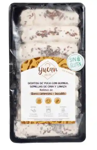 Deditos de yuca con queso campesino y bocadillo 500gr (8 unidades). Deditos 100% de yuca rellenos, listos para hornear y disfrutar. Aptos para celíacos, bajos en grasa libres de azúcar añadida y conservantes artificiales. 100% artesanales. Son ideales para tus snacks o como desayuno o cena, ya que tienen 3 macronutrientes que lo hacen un alimento completo además de deliciosos. Recomendaciones de preparación: Tan solo sacalos del congelador y ponlos en una fuente de calor (horno, airfryer, sarten), entre 8 y 10 min a temperatura alta. Ingredientes: Yuca, queso campesino, bocadillo, almidón de yuca, queso bajo en grasa, agua, hojuelas de quinua, semillas de chía y linaza