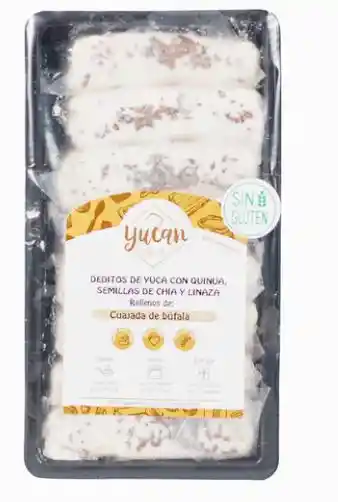 Deditos de yuca rellenos de cuajada de bufala 500gr (8 unidades). Deditos 100% de yuca rellenos, listos para hornear y disfrutar. Aptos para celíacos, bajos en grasa libres de azúcar añadida y conservantes artificiales. 100% artesanales. Son ideales para tus snacks o como desayuno o cena, ya que tienen 3 macronutrientes que lo hacen un alimento completo además de deliciosos. Recomendaciones de preparación: Tan solo sacalos del congelador y ponlos en una fuente de calor (horno, airfryer, sarten), entre 8 y 10 min a temperatura alta. Ingredientes: Yuca, cuajada de bufala, almidón de yuca, queso bajo en grasa, agua, hojuelas de quinua, semillas de chía y linaza