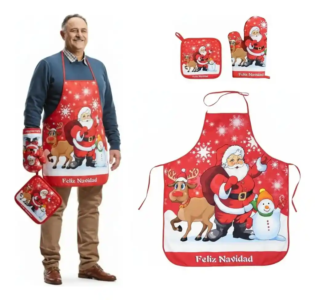 Kit Delantal Cocina Navideño,Guante y Agarradera Chef MV El kit completo (delantal, guante y agarradera) con temática navideña te permite cocinar de forma segura y temática como un verdadero Chef de Navidad. DESCRIPCION El Delantal Cocina Navideño es un conjunto textil diseñado para proteger la ropa y añadir un toque festivo al ambiente culinario durante las celebraciones de fin de año. Este producto es un Kit completo de vestimenta para Chef que sirve para la preparación de comidas y repostería en la cocina, protegiendo al usuario de salpicaduras y manchas. CARACTERISTICAS Delantal de cocina. Diseño navideño. Kit de chef. Incluye guante. Incluye agarradera. Protege la ropa. Uso para cocinar. QUE INCLUYE LA COMPRA x1 Kit Delantal Cocina Navideño,Guante y Agarradera
