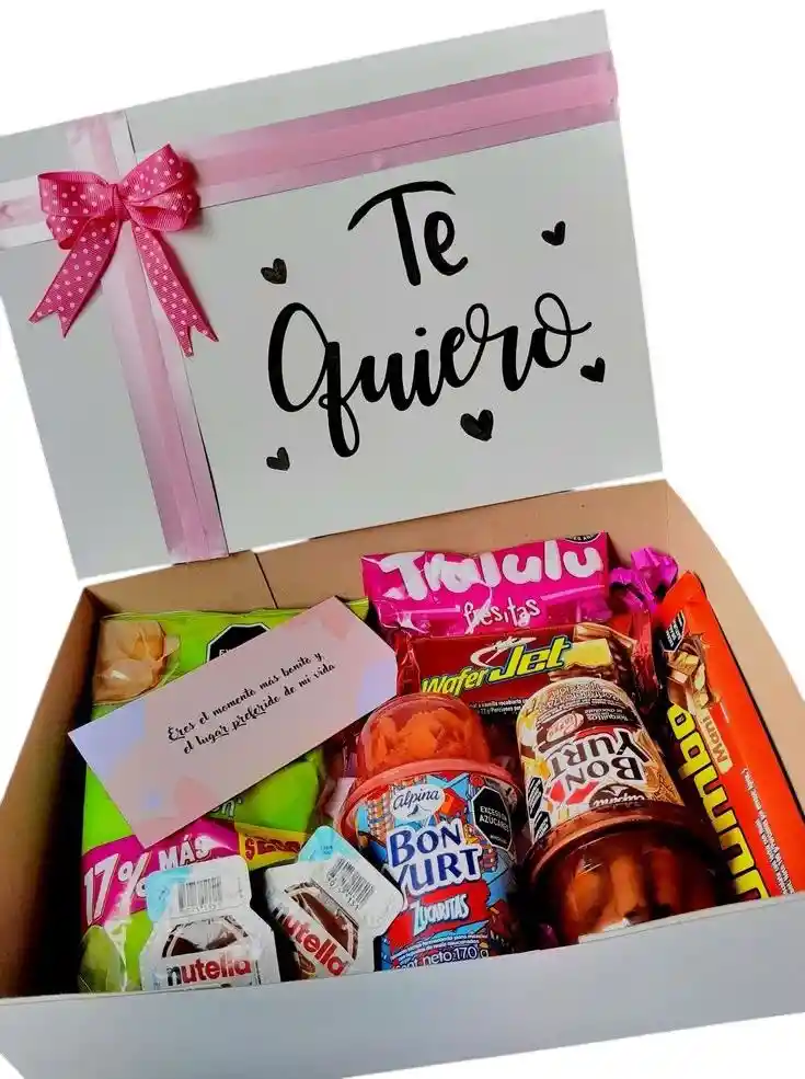 CAJITA DE CARTON CON CON MENSAJE PEROSNALIZDO CON DOS BONYURT , PAPAS MARGARITAS DE LIMON , GOMITOS , DOS NUTELLAS , CHOCOLATENA YET , CHOCOLATINA JUMBO TARJETA PERSONALIZADA