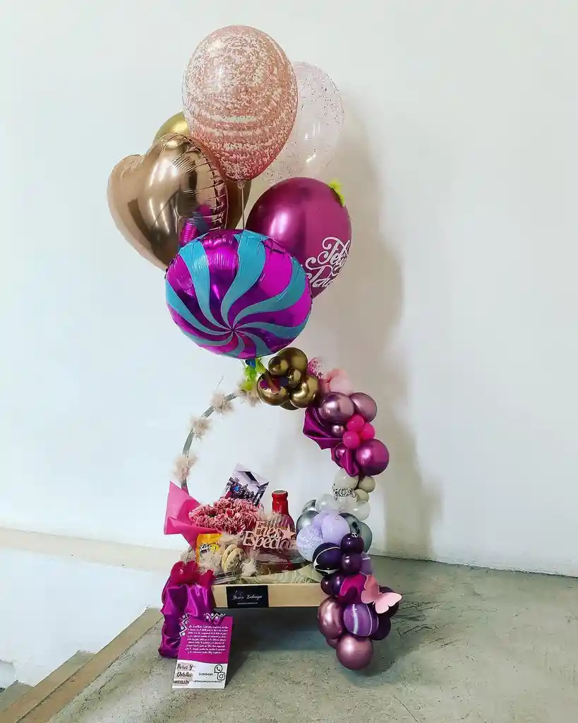 Detalle en base de madera con variedad de alimentos como sandwich,fruta,jugo,golosinas,tejido de globos,flores y decorativos elegantes según imagen. ( tarjeta incluida)
