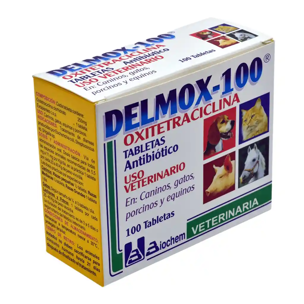 COMPOSICIÓN: Cada Tableta de DELMOX-100 Tabletas contiene: Oxitetraciclina Clorhidrato 250 mg / Excipientes c.s.p. 1 Tableta. PRESENTACIÓN: Caja x 100 tabletas. 10 blíster de 10 tabletas. ANTIBIÓTICO USO EN:Caninos, gatos, porcinos y equinos USOS: Infecciones causadas por Staphylococcus, Bordetella sp., Brucella sp., Bartonella sp., Haemophilus sp., Pasteurella multocida, Shigella sp., Yersinia pestis, Actinomyces sp., Bacillus anthracis, Clostridium perfringens, Clostridium tetani., Listeria monocytogenes, Nocardia sp., Micoplasma sp., Chlamydia sp., y Rickettsia sp. ENFERMEDADES: Erliquiosis (Ehrlichia canis) Infecciones en sistemas digestivo, genitourinario y óseo. Infecciones bacterianas dermatológicas causadas por Haemobartonella, Mycoplasma y Chlamydia. Infecciones respiratorias producidas por complicaciones bacterianas de enfermedades virales como Moquillo y Rinotraqueitis infecciosa felina. Infecciones bucodentales: gingivitis, periodontitis, estomatitis que causan halitosis (mal aliento). MECANISMO DE ACCIÓN: La Oxitetraciclina es bacteriostática. Inhibe la síntesis de proteínas de forma inmediata y total evitando el crecimiento y la reproducción de los organismos sensibles, al ligarse al ribosoma bacteriano 30S, evita la llegada del complejo aminoacil ARNt al sitio receptor en el complejo ARNm-ribosoma de forma irreversible, e impide la incorporación de los aminoácidos que a la cadena peptídica, inhibiendo de esta forma la síntesis de proteínas. Las tetraciclinas orales se absorben en el estómago y en la primera porción del intestino delgado, con biodisponibilidad mayor al 70% en 1 a 3 horas. La absorción disminuye cuando se administra junto con alimentos (sobre todo leche o derivados lácteos. VÍA DE ADMINISTRACIÓN Y DOSIS: Administrar por vía oral, a razón de 1 tableta al día para 25-40 kilos de peso (equivale a 5.5 a 11 mg/Kg/día). DOSIS DE DELMOX TABLETAS EN PERROS Y GATOS: Se recomienda dividir en dos, la dosis diaria, para administrar cada 12 horas, con suficiente agua o alimento. CONTRAINDICACIONES: No usar en hembras gestantes ni cachorros menores de un año. TIEMPO DE RETIRO: Carne: Los porcinos no deben sacrificarse para consumo, hasta 21 días después de finalizar el tratamiento. Uso Veterinario Manténgase fuera del alcance de los niños. Consulte al Médico Veterinario