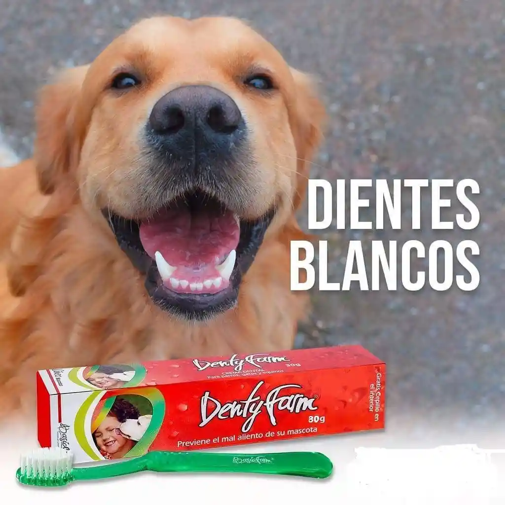 Dentyfarm Crema dental Descripción Crema dental especialmente desarrollada para perros gatos y caballos, a base de Clorhexidina Digluconato y Aloe Vera, posee un efecto antiséptico y antiinflamatorio sobre las encías y dientes, su fórmula permite que el animal la pueda ingerir sin correr riesgos de irritación o malestar gástrico. Dentyfarm tiene un agradable sabor, lo cual genera aceptación del producto en la mascota. Beneficios Aroma agradable y prolongado Crema antiséptica para el control de afecciones como gingivitis, estomatitis y periodontitis. Seguro para la mucosa gástrica Adecuada para su uso en cualquier etapa de la vida Previene el mal aliento y ayuda al mantenimiento de la higiene bucal. Contiene cepillo dental para una administración más sencilla. Modo de uso Aplicar 2 a 3 gr de crema dental DENTYFARM sobre el cepillo, cepillar masajeando la encía y los dientes del animal. También se puede aplicar DENTYFARM directamente sobre la encía del animal y posteriormente realizar masaje. El cepillado debe ser frecuente; de manera ideal se deben cepillar los dientes mínimo 3 veces por semana para alcanzar el objetivo de mantener una boca saludable. No necesita enjuague ya que está especialmente desarrollada para ser segura aún cuando se ingiere; no irrita ni lastima el estómago del animal. Se recomienda recompensar a la mascota luego de la limpieza, para mejorar su predisposición al cepillado. Presentación – Tubo colapsible por 30 gramos + cepillo dental – Tubo colapsible por 80 gramos + cepillo dental Somos MÁS MASCOTAS Y MÁS Pet Shop DONDE ENCUENTRAS TODO LO QUE LOS PELUDITOS DE LA FAMILIA REQUIEREN. Atención 24 Horas. Distribuidores Oficiales.