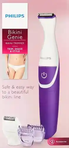Domina el vello con precisión y sin dolor. Philips BikiniGenie es una opción excelente para retocar el pelo corporal y darle el estilo que quieras. ¡Libérate! Es perfecta para usar en tus piernas si lo que buscas es tenerlas lisas y sedosas por más tiempo. El área del cavado es sensible y necesita de un cuidado especial. Ahora podrás recortar la zona y definirla de forma práctica y segura. La limpieza es lo primero Su cabezal es lavable, así que simplemente enjuágalo bajo el agua corriente para una limpieza rápida. Su pequeño cepillo de limpieza te ayudará a eliminar el vello acumulado en las pinzas de depilación. La practicidad a tu alcance Pensada para agilizar tu rutina, es 100% resistente al agua. ¡Puedes usarla dentro y fuera de la ducha! ¿Existe algo más cómodo que eso? Accesorios incluidos Además, este producto incluye cabezal afeitador, cabezal recortador, peine recortador de 3 mm, peine recortador de 5 mm. Podrás prevenir la irritación y garantizar un corte preciso y uniforme con su cabezal recortador. Te brindará resultados excelentes para los detalles más pequeños o incluso áreas completas.