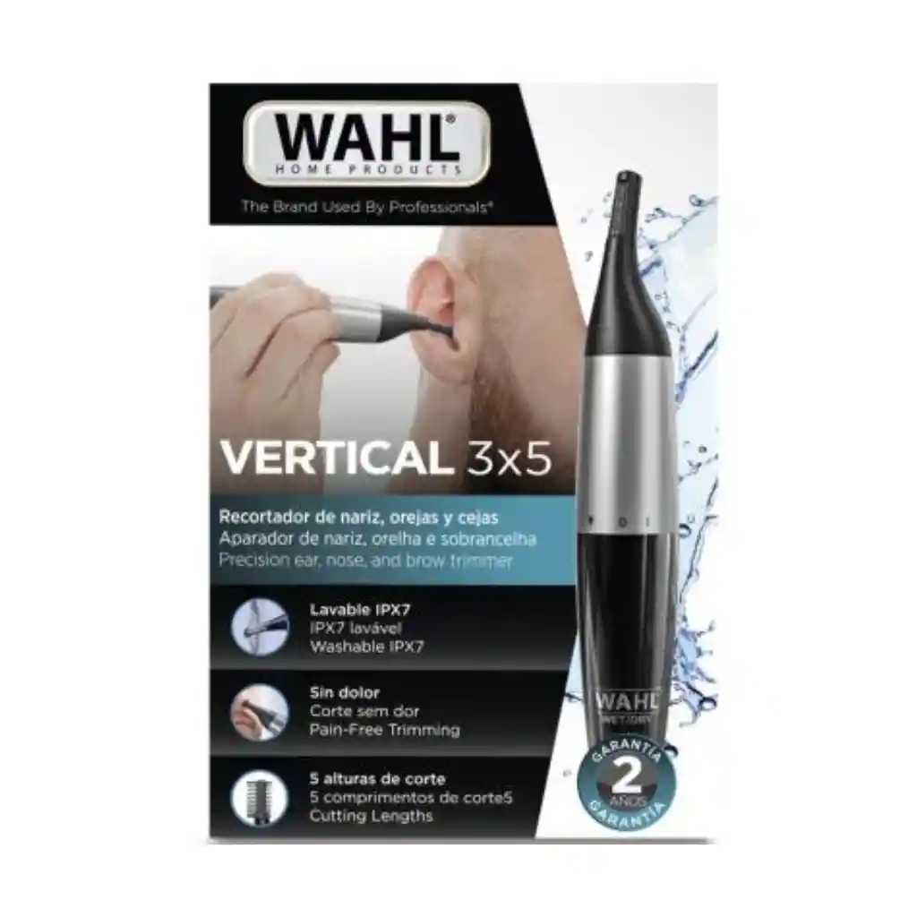 Trimmer Personal Vertical 3X5 Wahl 05560-3908 Recortador de Nariz Orejas y Cejas, Lavable Suave y sin dolor, 5 Longitudes de Corte CONTENIDO DEL KIT: - Recortadora de nariz, orejas, y cejas - Peine - Guía para cejas (2-5 mm) - 1 batería AA - Estuche de almacenamiento