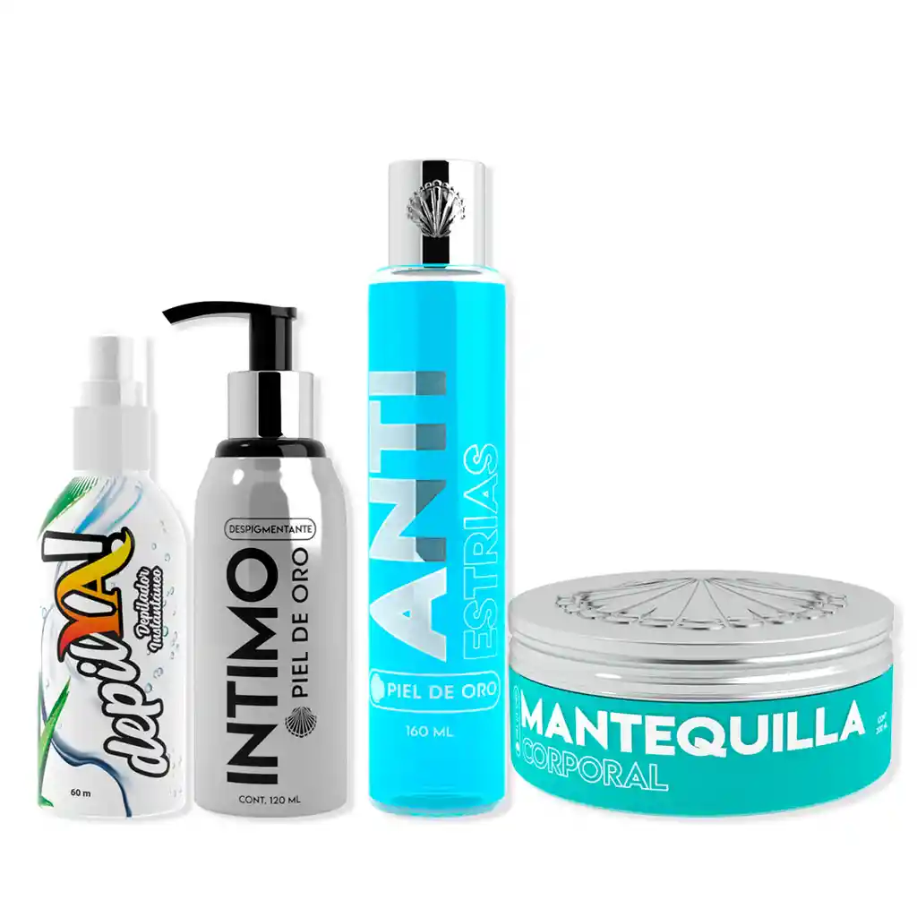 Para tu cuidado completo los mejores aliados que puedes tener: Loción para Depilar Depilya - Depila en 60 segundos.Despigmentador y Aclarador Intimo - Desmancha todas las partes del cuerpo.Aceite Corporal Anti estrías - Ayuda a prevenir las estrías y a desvanecerlas, además de estimular el crecimiento de las uñas y el cabello.Puedes escoger el hidratante que mas se acomode a tu gusto. Exfoliante Corporal o Facial - Remueve células muertas activando la circulación sanguínea.Mantequilla Corporal Hidratante: Te ayudara activar la elasticidad de tu piel, regenera las celular muertas y además evita la resequedad en la piel, aportando un brillo y olor único.