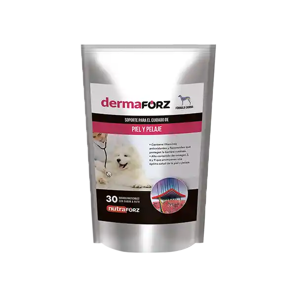 Bocados palatables blandos para perros, para soporte dermatológico nutricional. – Fórmula avanzada con ácidos grasos omega y antioxidantes para el soporte de piel y pelaje. – Formulado con omega 3, 6 y 9 para promover la recuperación de tejidos, una piel y un pelaje sano. – Contiene Semillas de Perilla, Aceite de Cártamo, Aceite de Pescado, Aminoácidos, Ácido Hialurónico, Extracto de Semilla de Uva, MSN, Vitamina C, Vitamina E, Metionina, L-Cisteína y Zinc.